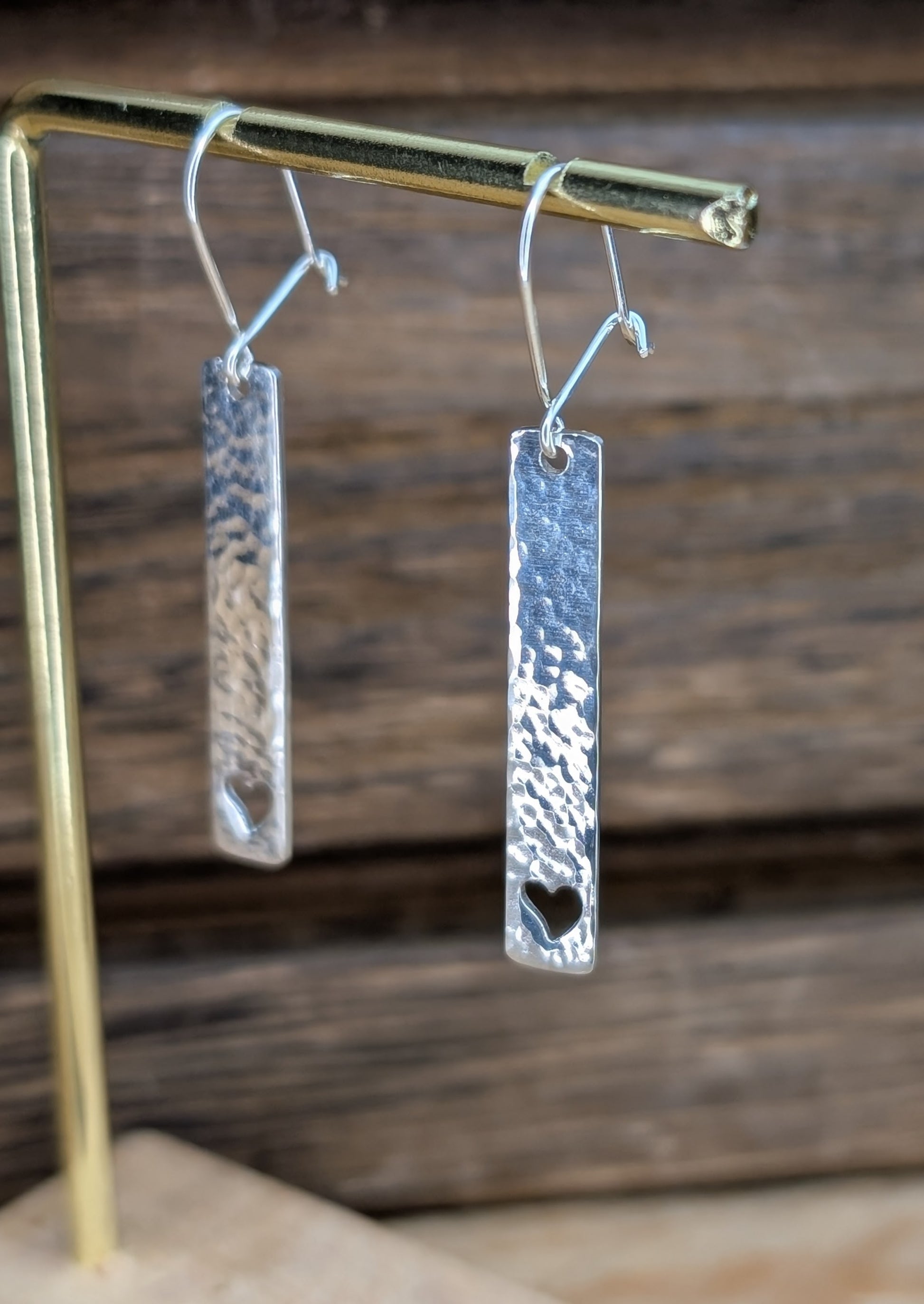 elevate your style with our sterling silver heart bar dangle earrings! crafted with a 30mm x 5mm bar featuring a heart-shaped cutout and a hammered finish, these earrings will add a touch of elegance to any outfit. the secure wire with safety hook ensures you can wear them with confidence. perfect for any occasion.