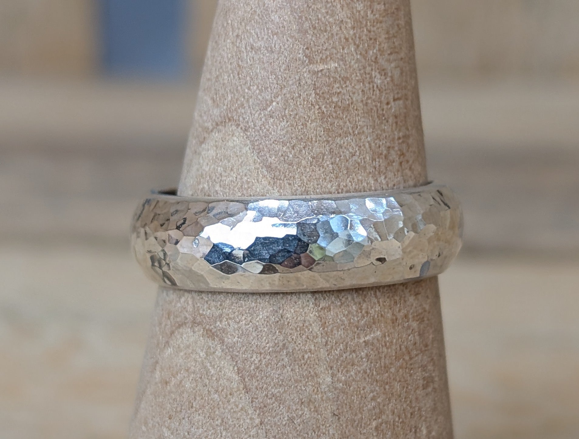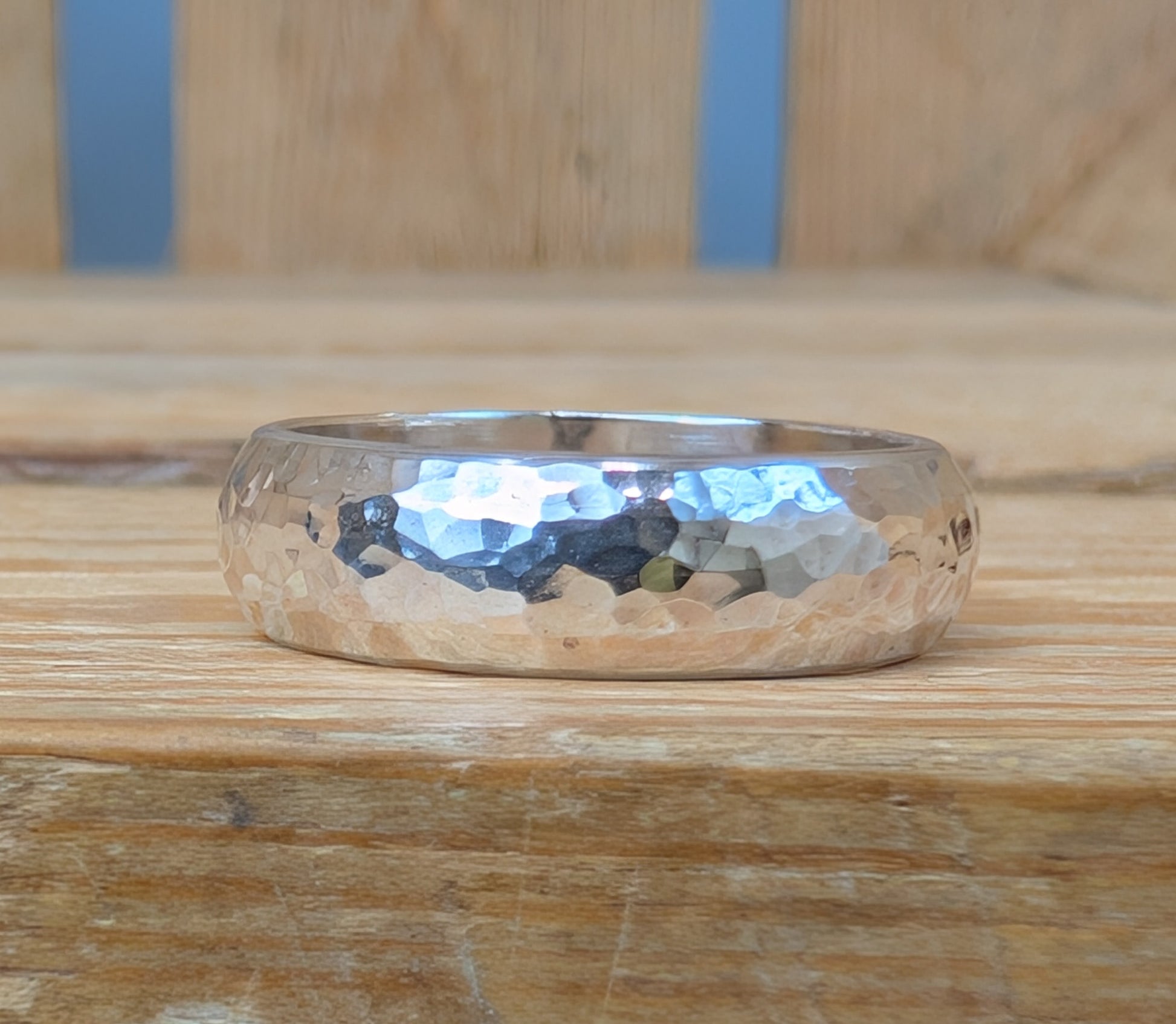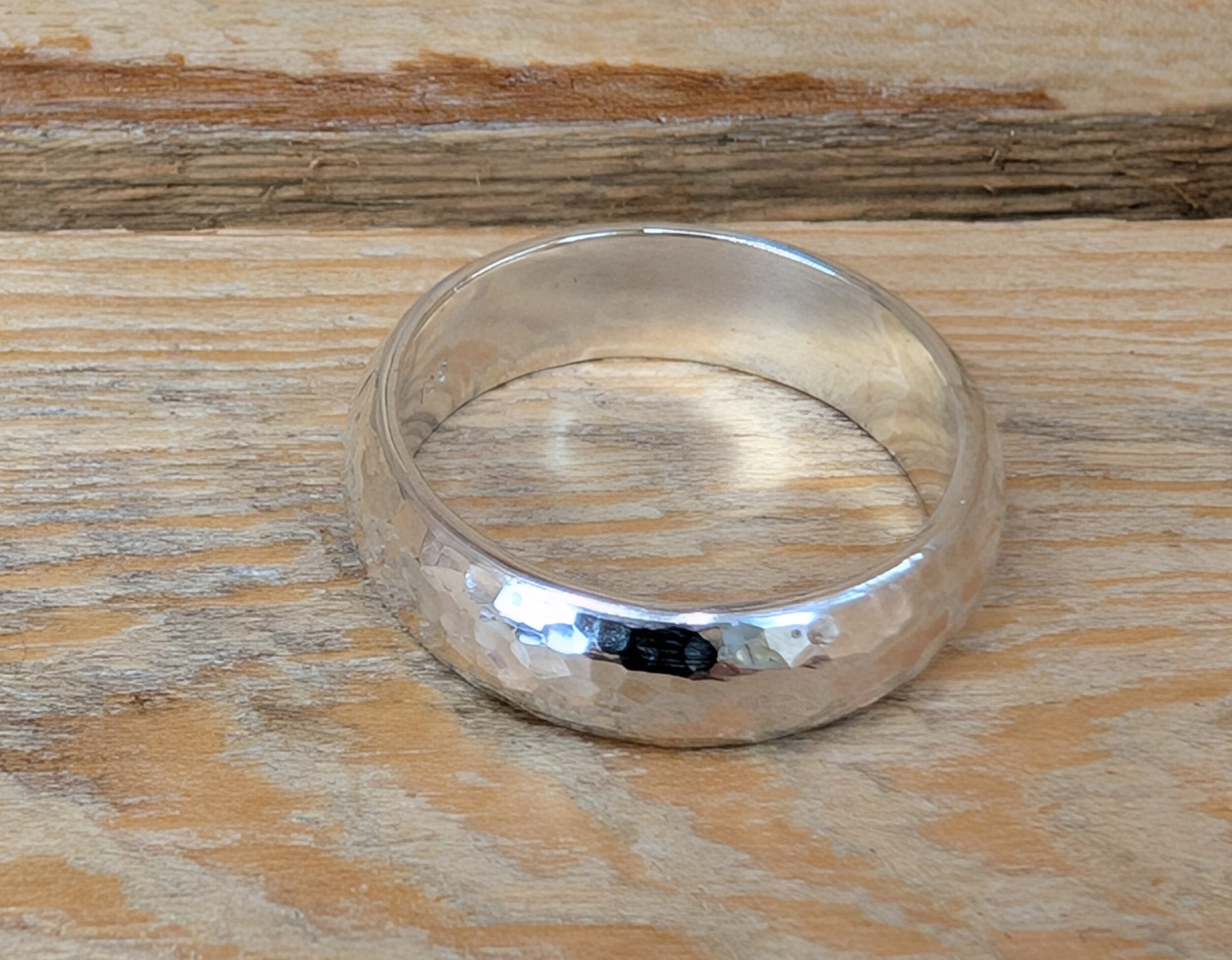introducing our stunning sterling silver 6mm curved hammered band. this handcrafted piece boasts a unique and eye-catching design that will surely impress. made with high-quality sterling silver, it is durable and will make a lasting addition to any jewellery collection.
