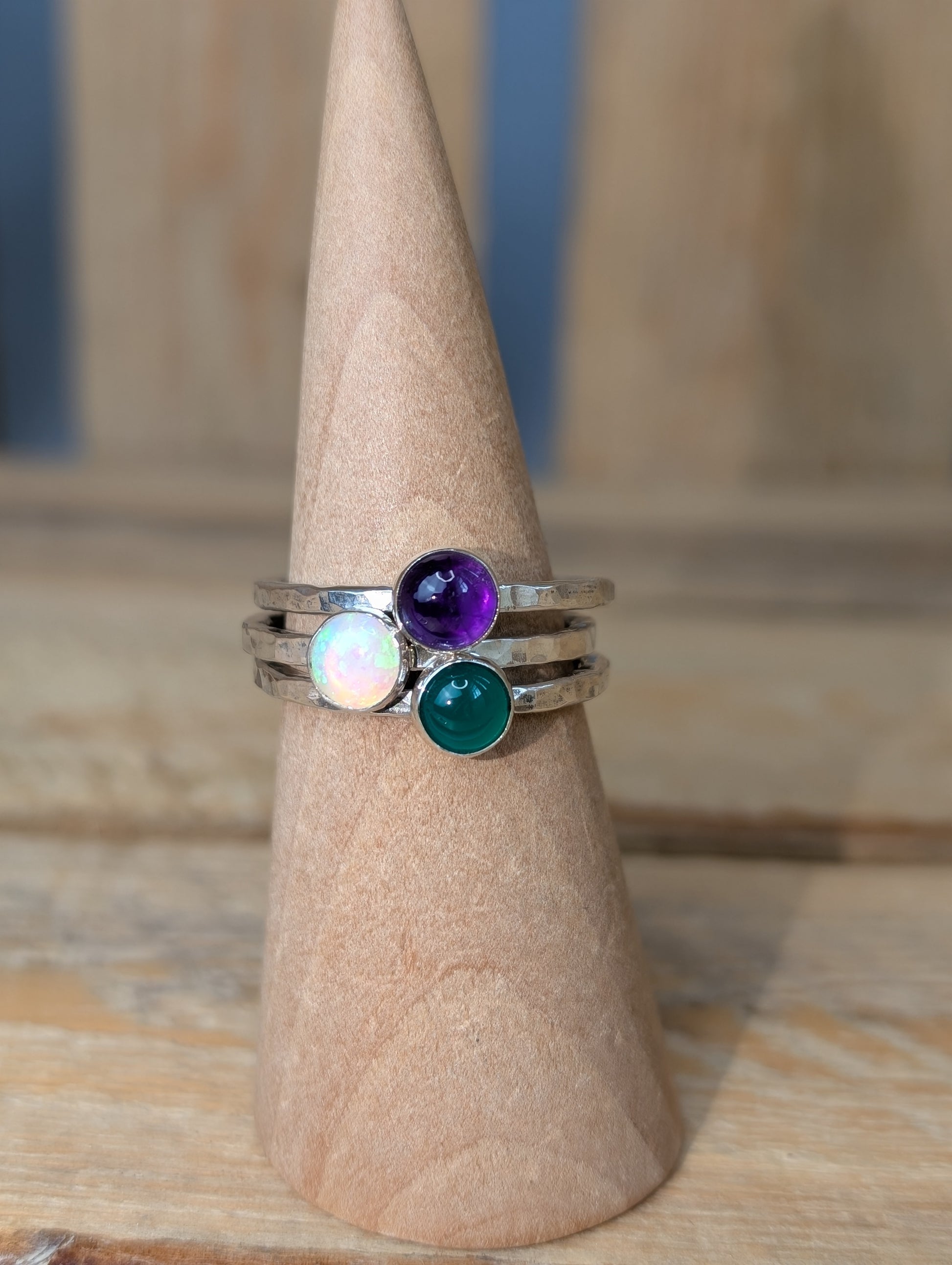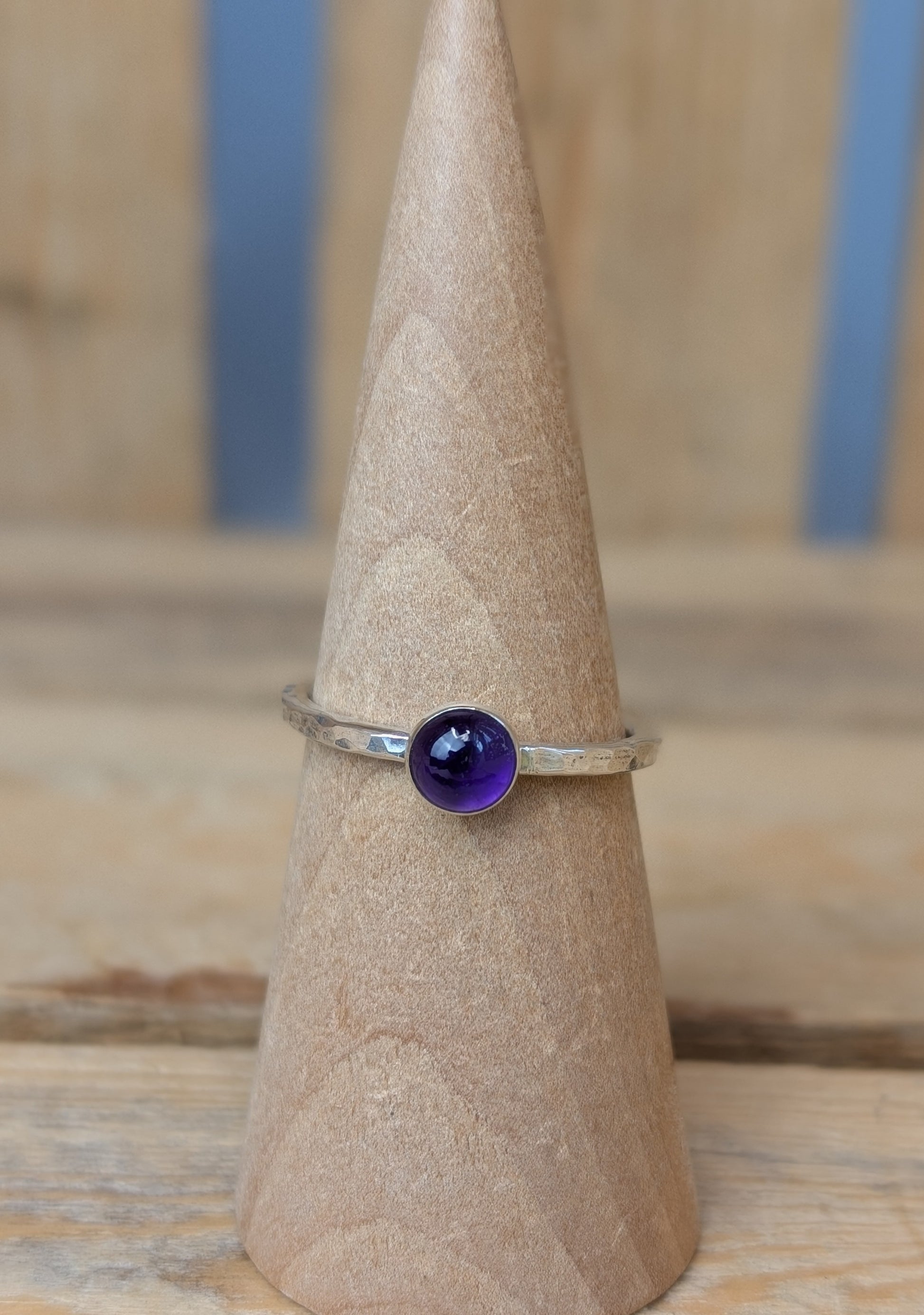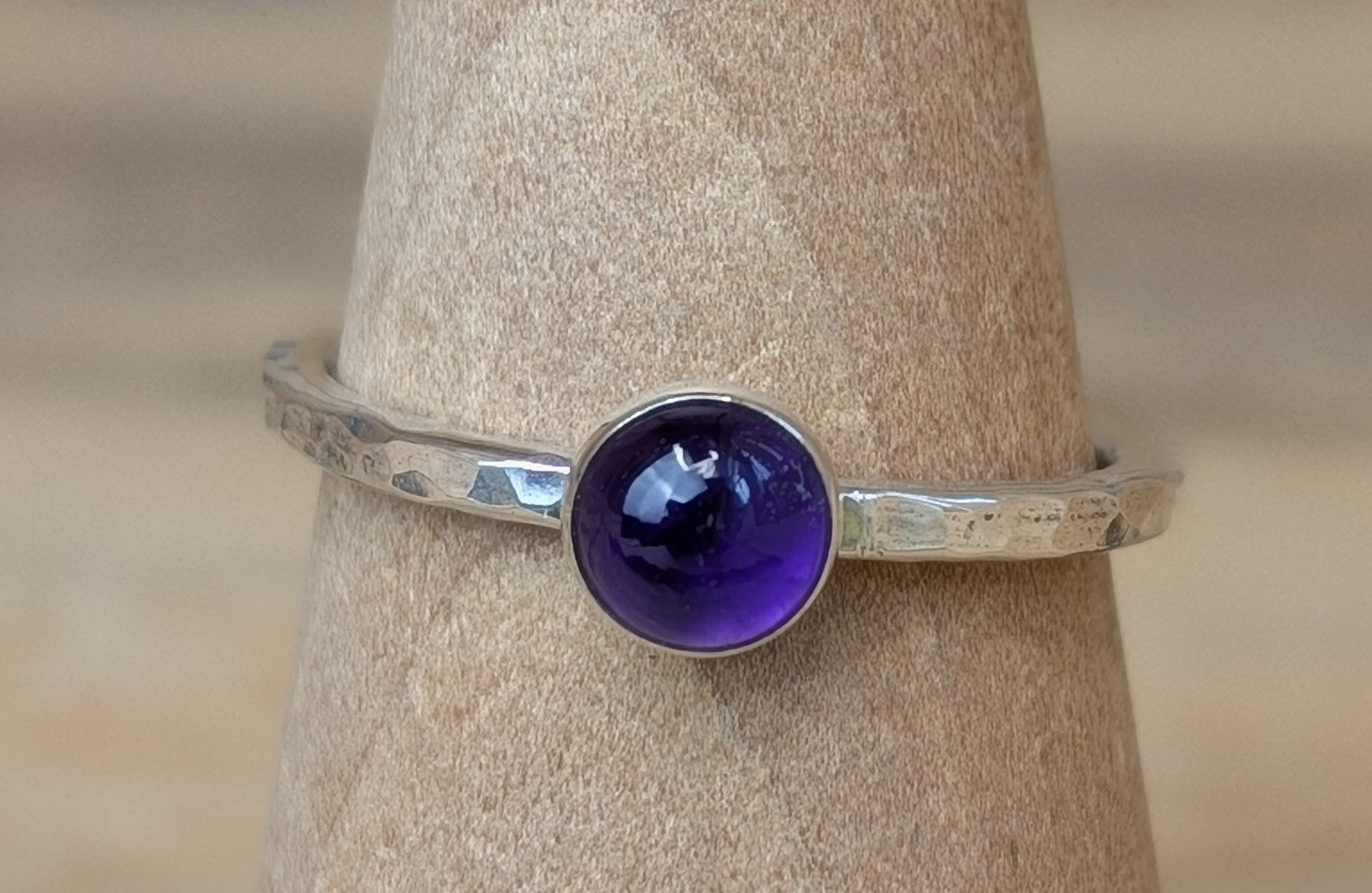 elevate your style with our stunning sterling silver gemstone stacking ring! crafted with a hammered 2mm band and a 6mm amethyst cabochon, this ring can be worn alone or stacked with our other silver stacking rings for a unique look. add a touch of elegance and versatility to any outfit.