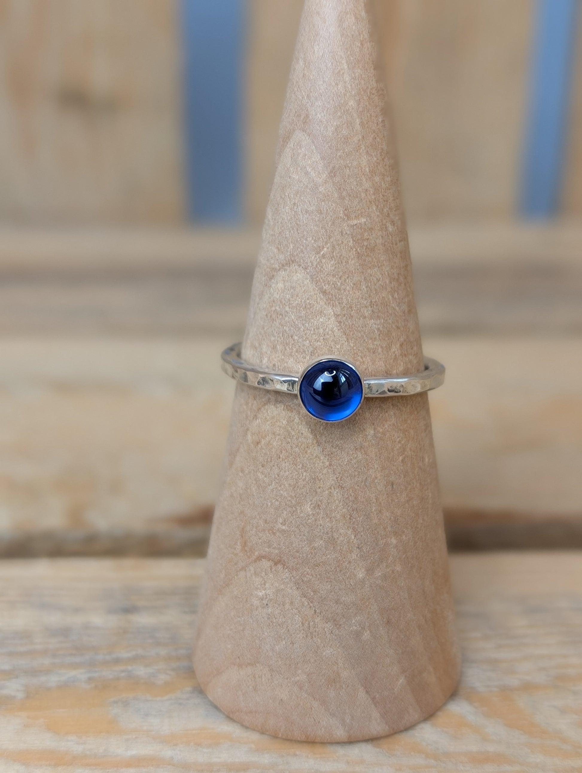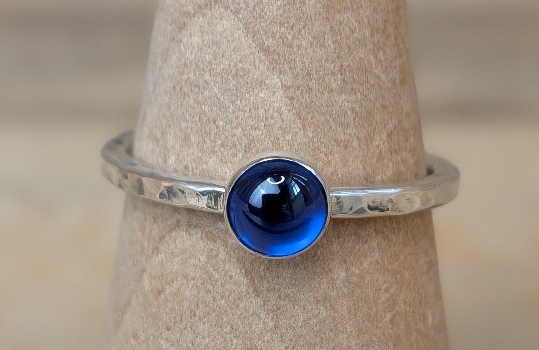 elevate your style with our stunning sterling silver gemstone stacking ring! crafted with a hammered 2mm band and a 6mm synthetic blue spinel cabochon, this ring can be worn alone or stacked with our other silver stacking rings for a unique look. add a touch of elegance and versatility to any outfit.