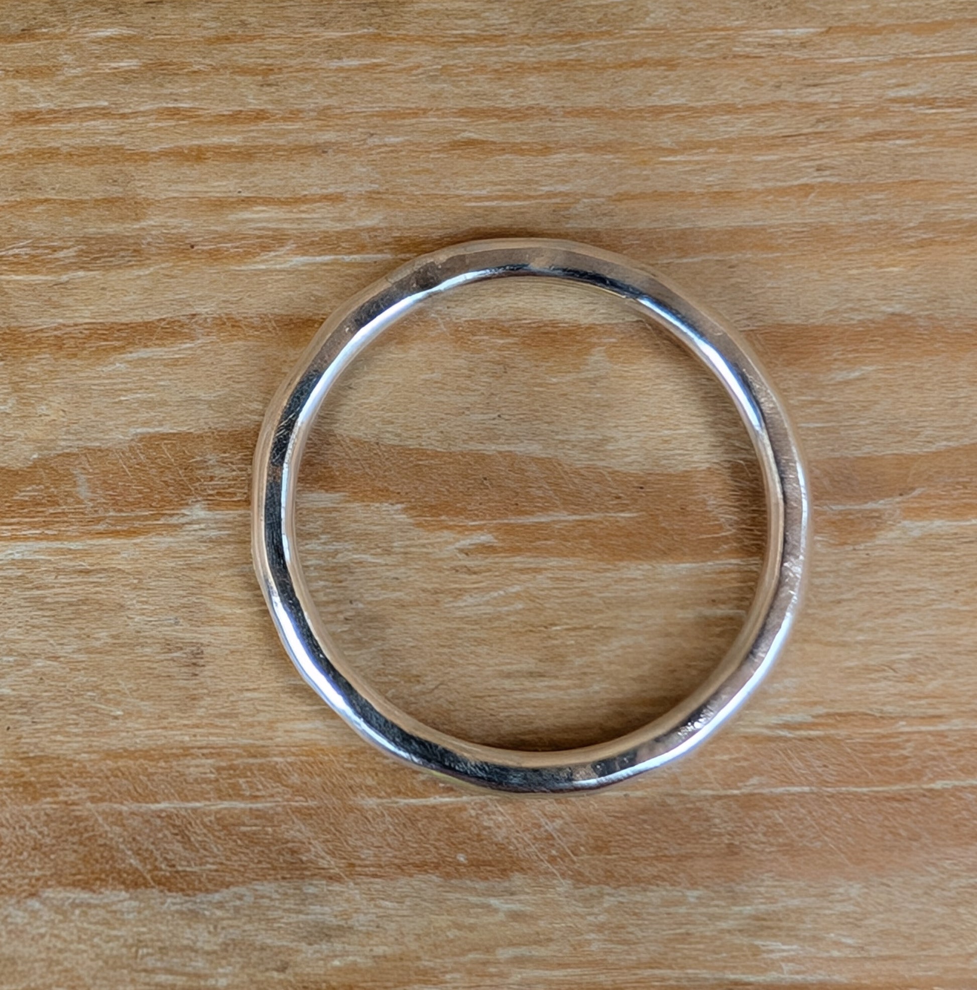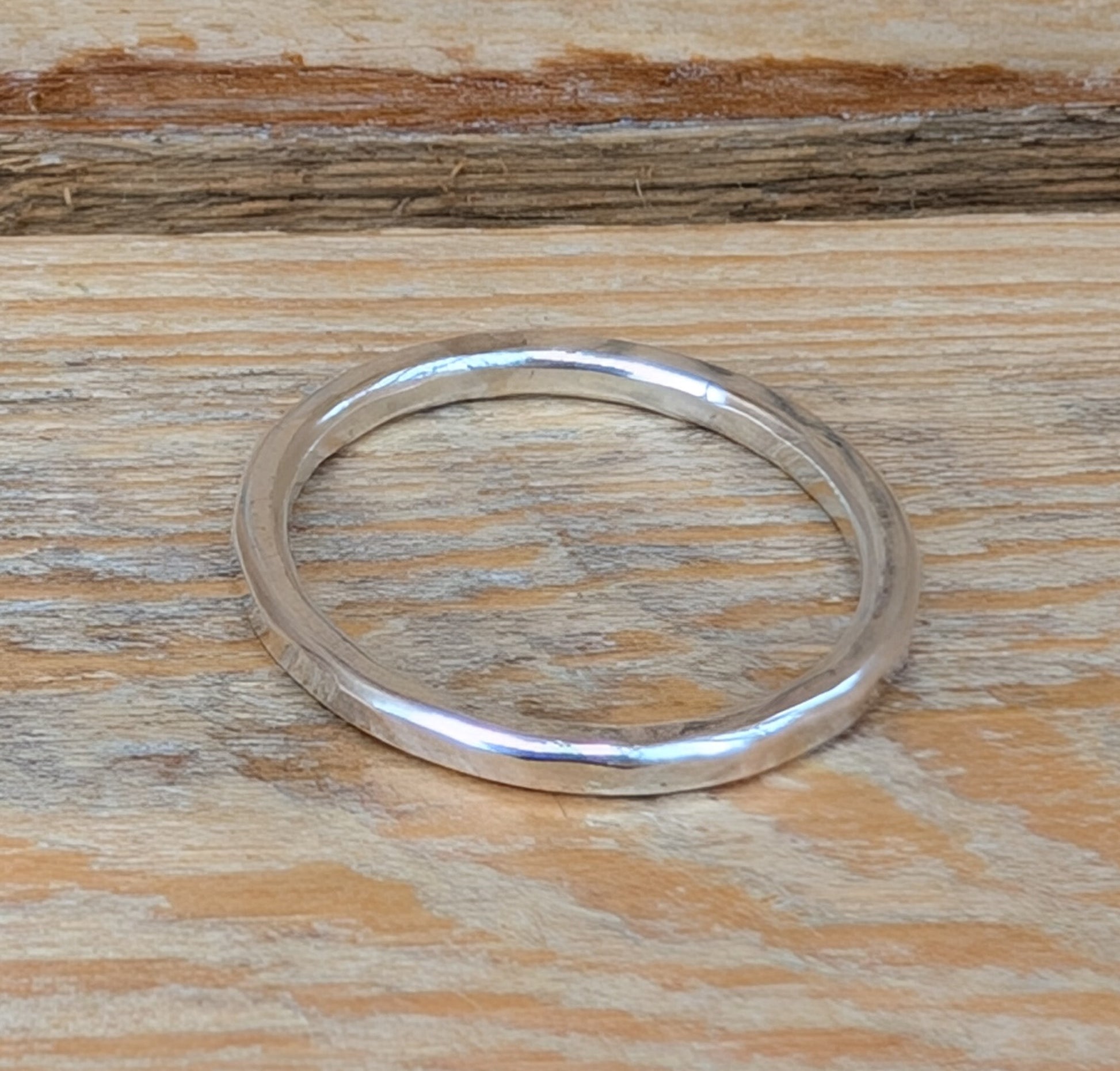 elevate any look with our stunning sterling silver flat hammered stacking ring! featuring a sleek and versatile design, this ring can be worn alone or stacked with others for a unique and stylish touch. crafted from 2mm round high-quality sterling silver wire, it is sure to add a touch of elegance to any outfit.
