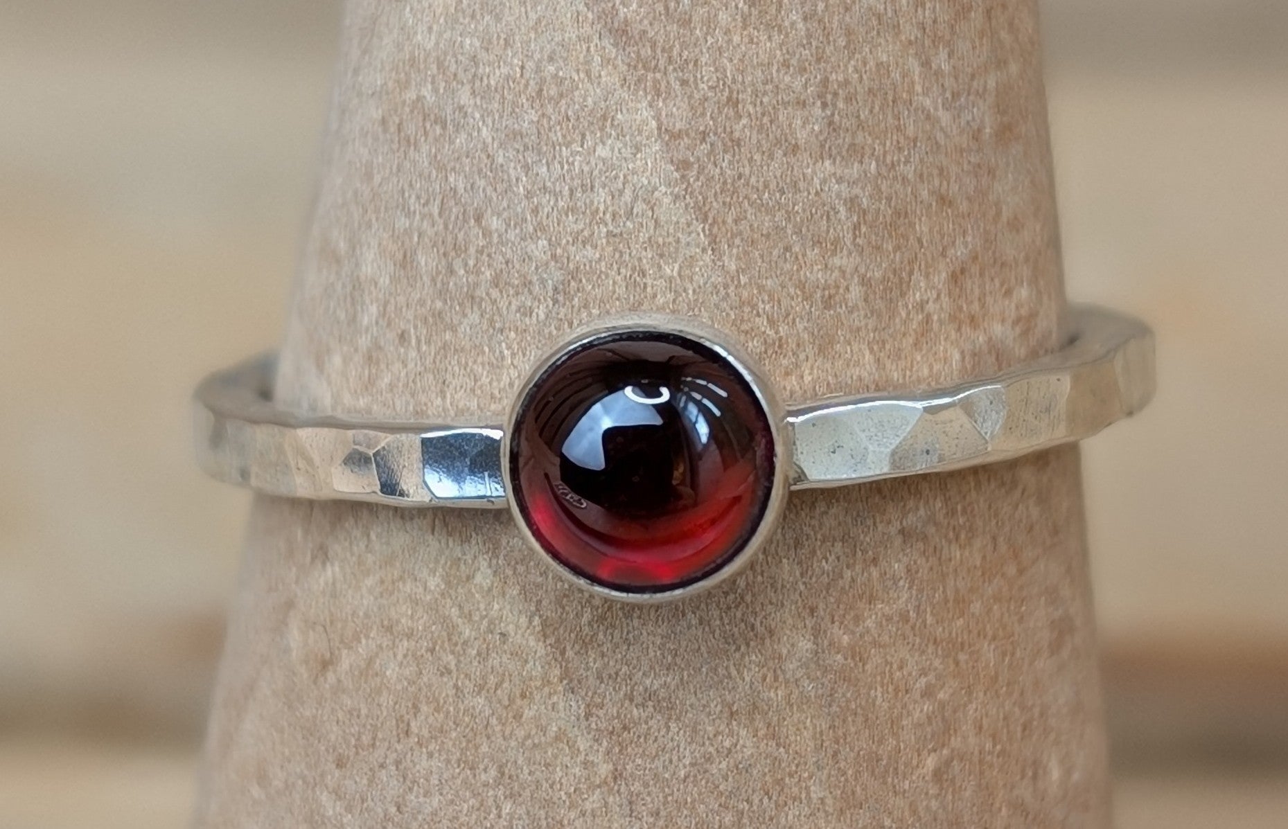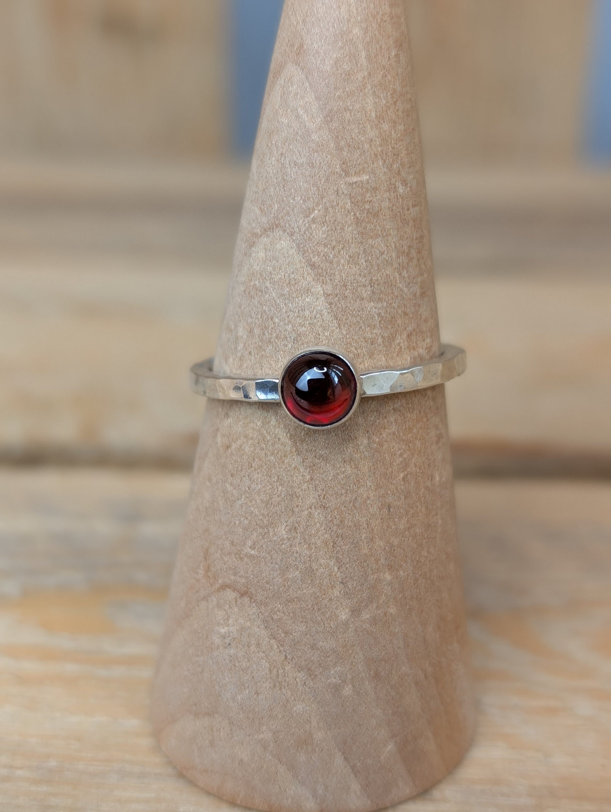 elevate your style with our stunning sterling silver gemstone stacking ring! crafted with a hammered 2mm band and a 6mm garnet cabochon, this ring can be worn alone or stacked with our other silver stacking rings for a unique look. add a touch of elegance and versatility to any outfit.