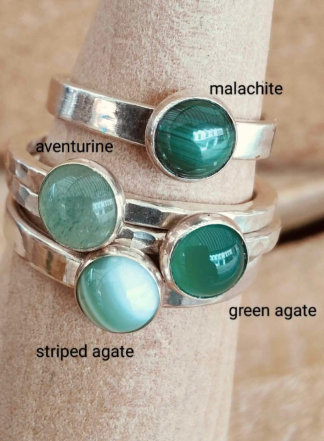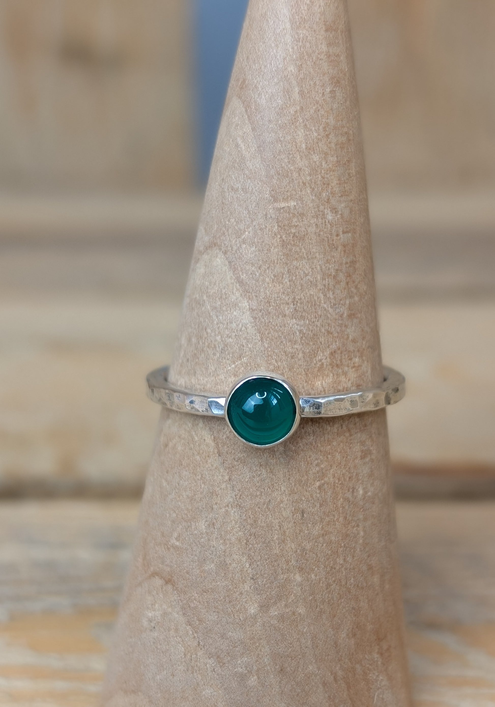 elevate your style with our stunning sterling silver gemstone stacking ring! crafted with a hammered 2mm band and a 6mm green agate cabochon, this ring can be worn alone or stacked with our other silver stacking rings for a unique look. add a touch of elegance and versatility to any outfit.