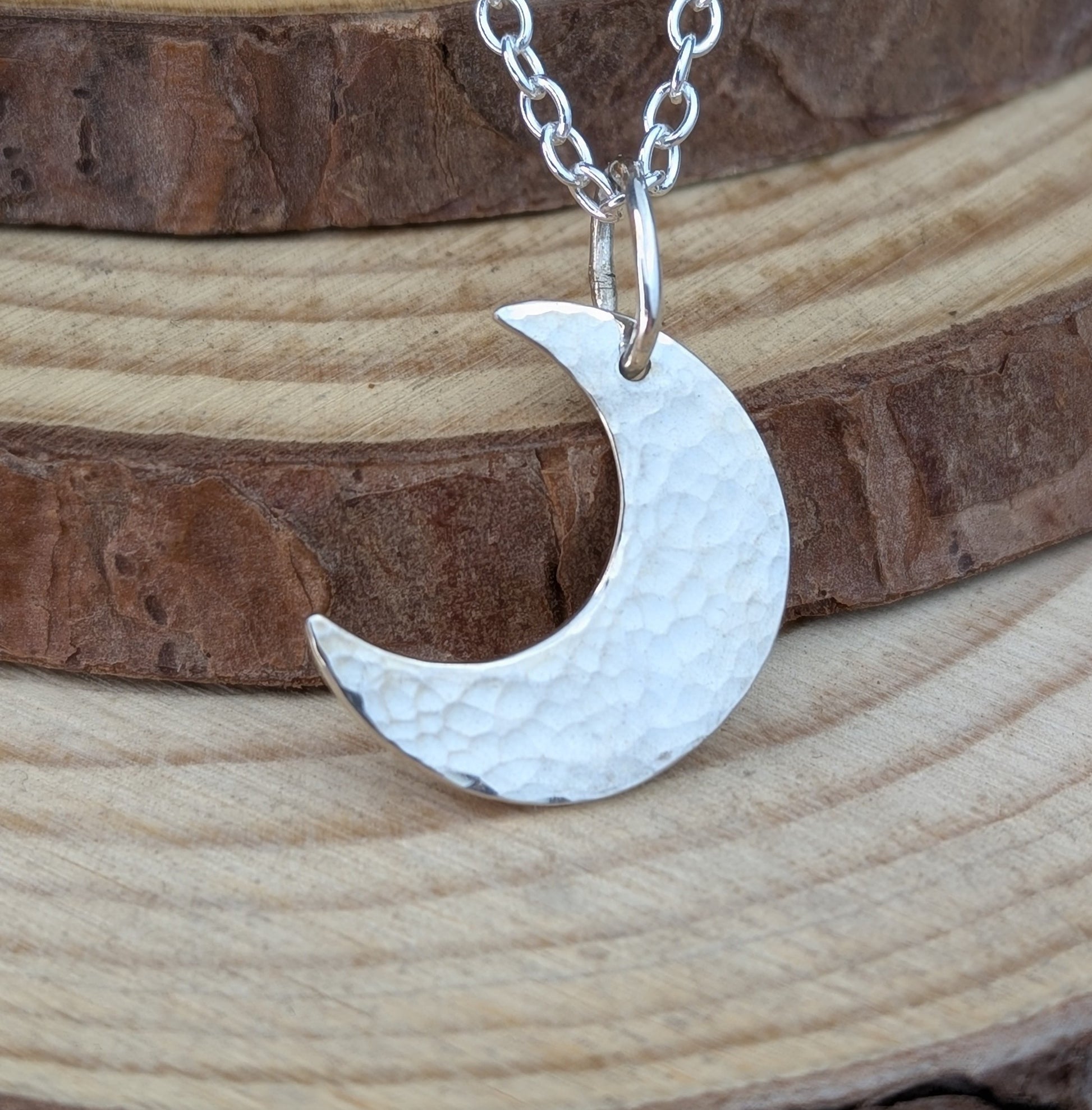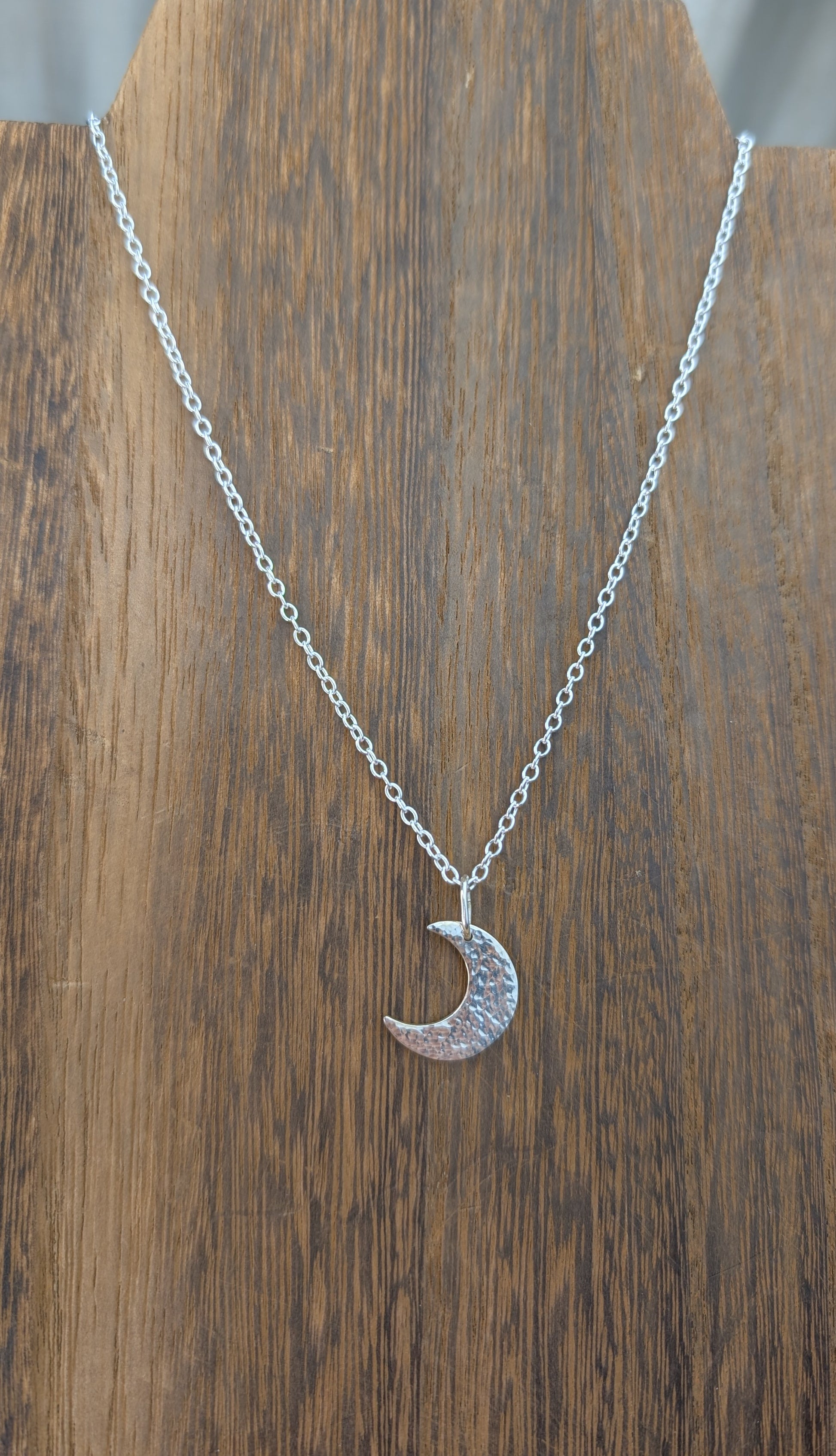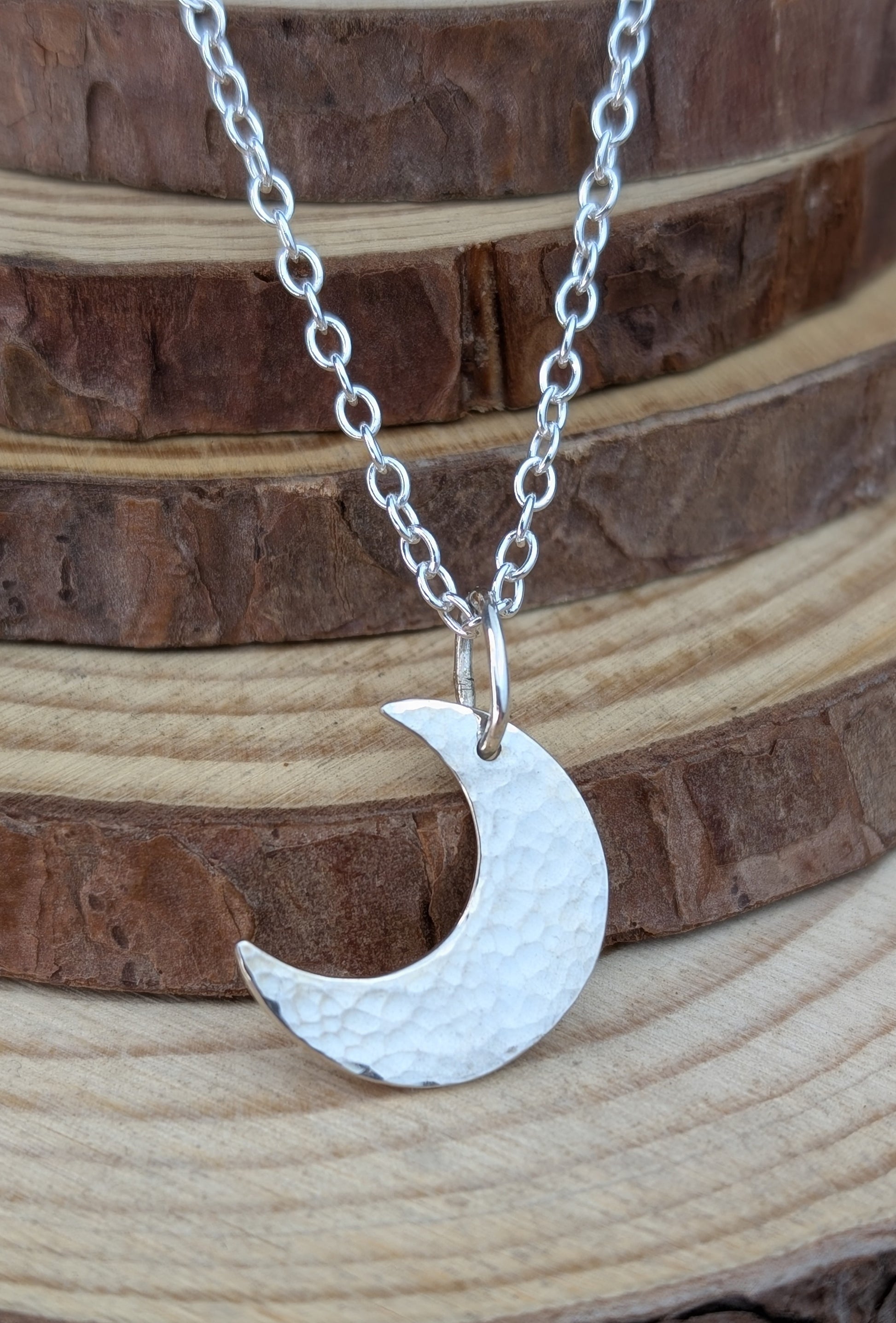 add a touch of celestial beauty to your jewellery collection with our sterling silver hammered crescent moon pendant. hand-crafted with a 18mm hammered charm which shines on a 2.3mm trace chain in your choice of 16" or 18" lengths. elevate your style and embrace the magic of the moon!