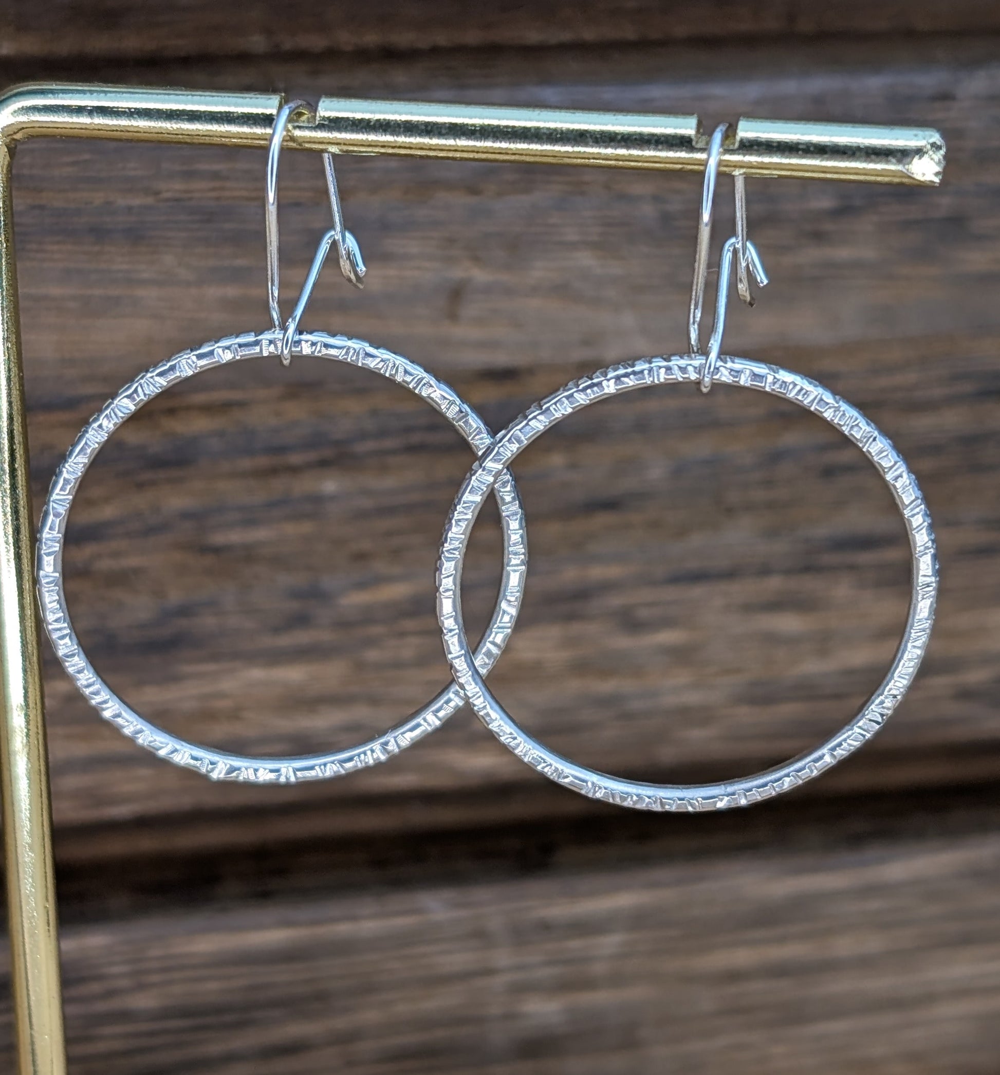 elevate your style with these sterling silver dangle earrings! featuring a forward-facing 28mm textured circle made with 1.5mm round wire, these earrings add a touch of sophistication to any outfit. the safety hook ensures they stay in place all day and night! complete your look with these versatile and elegant earrings.