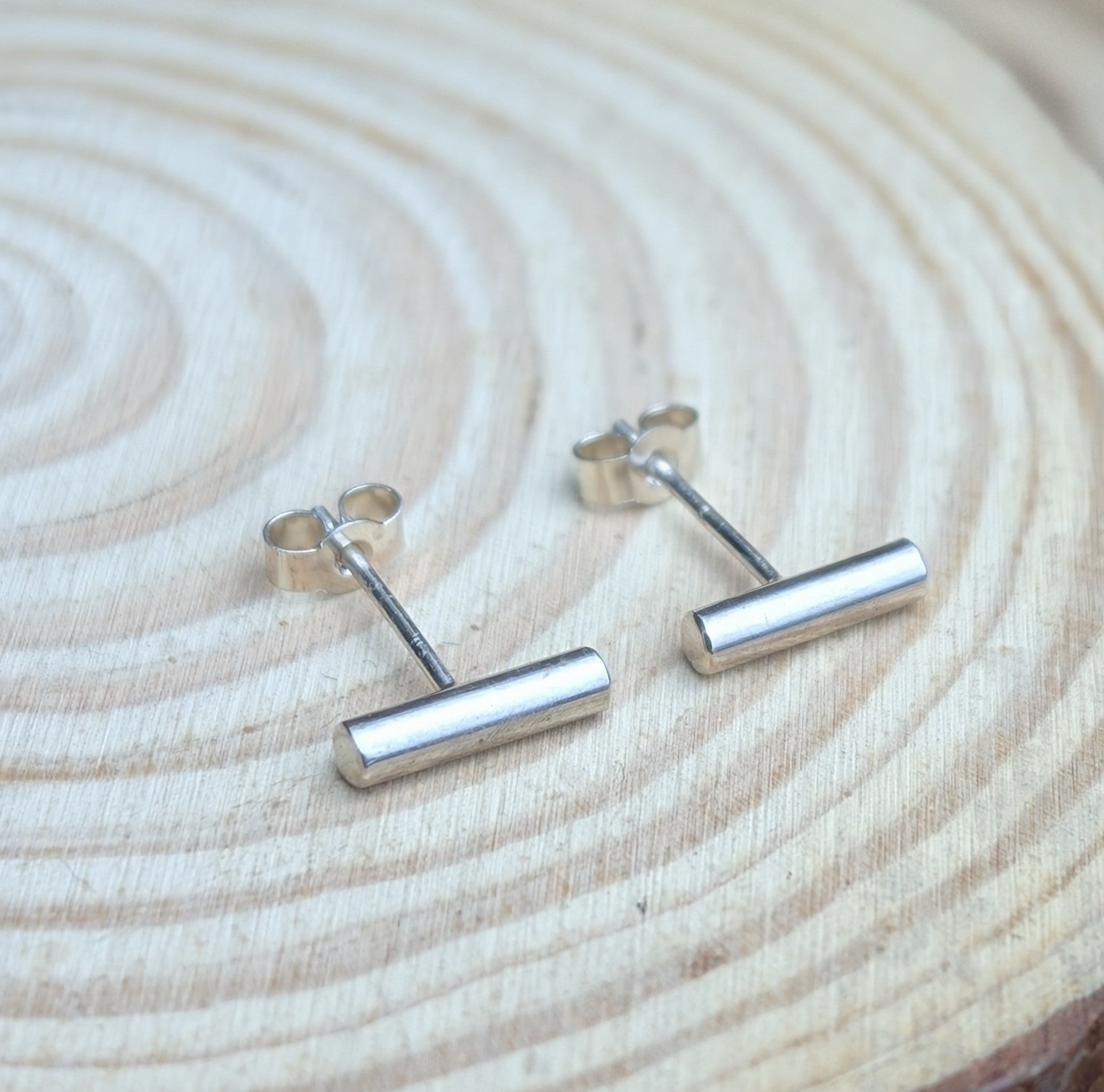 elevate your style with our sterling silver round bar studs! these 10mm long earrings are crafted from 1.5mm round wire and feature a secure scroll back. perfect for everyday wear. upgrade your accessory game with these timeless studs.