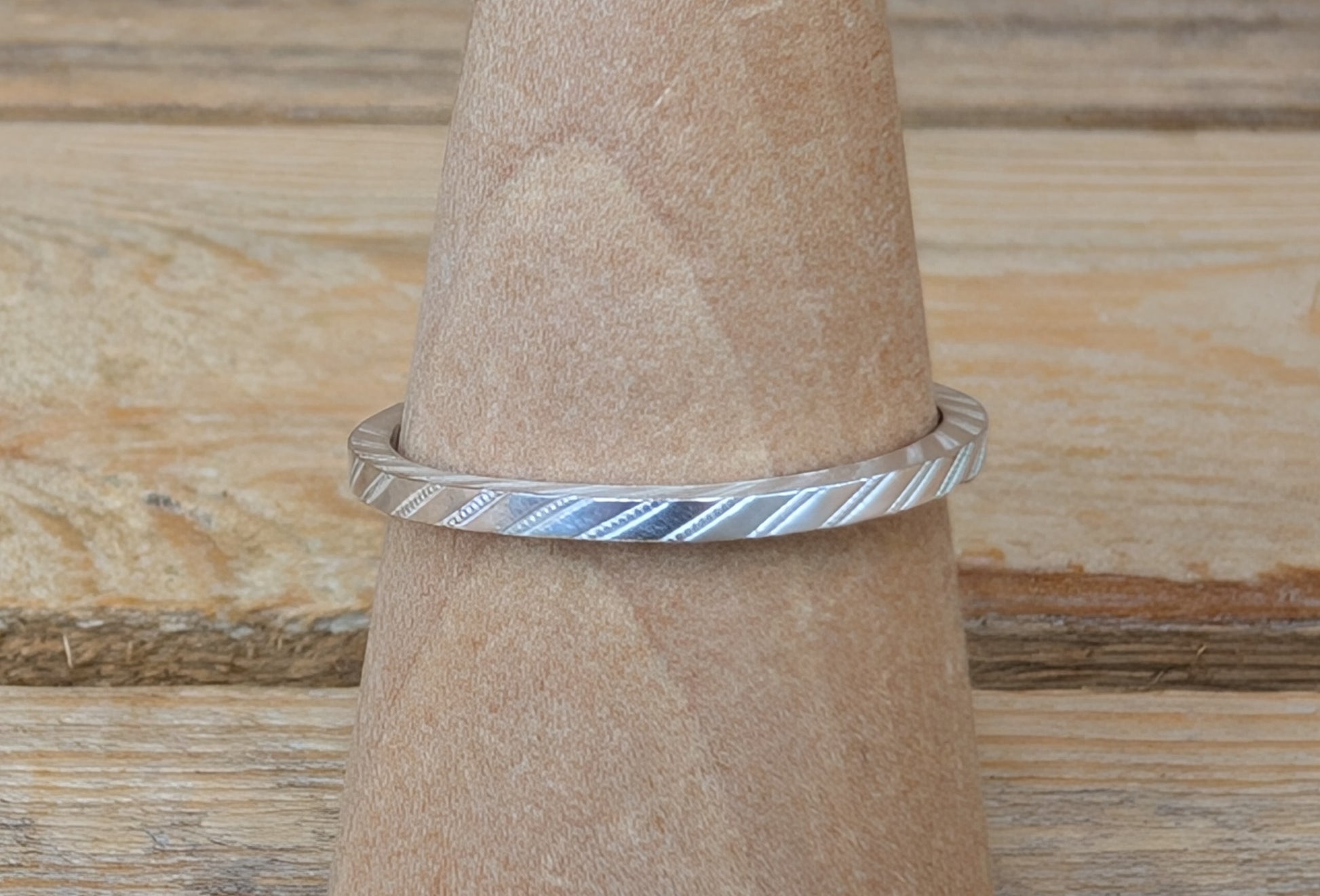 elevate any look with our stunning sterling silver square patterned stacking ring! featuring a sleek and versatile design, this ring can be worn alone or stacked with others for a unique and stylish touch. crafted from 1.65mm square high-quality sterling silver, it is sure to add a touch of elegance to any outfit.