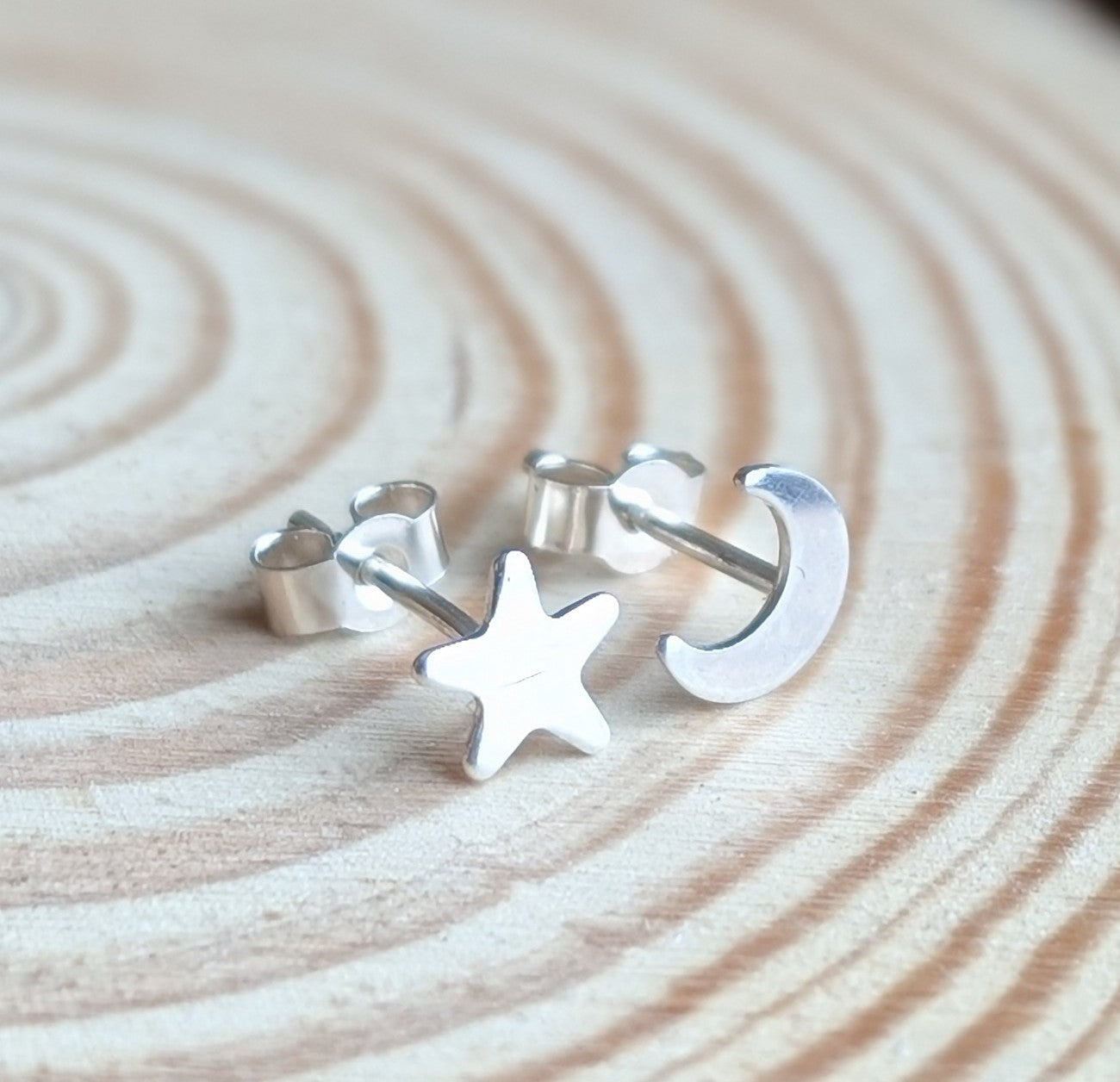 complete your outfit with these elegant sterling silver mismatched studs. crafted with high-quality, genuine sterling silver, each pair features a delicate 5.25mm star design and a 6mm crescent moon design, with a secure scroll back. these timeless studs add a touch of fun to any look.